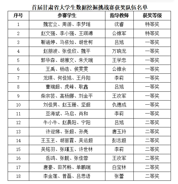 近日,由甘肃省教育厅联合甘肃省老员工数据挖掘挑战赛组织委员会主办的首届甘肃省老员工数据挖掘挑战赛落下帷幕。公司bevictor伟德官网、数学公司的学子们获得18个奖项,为公司赢得了荣誉。